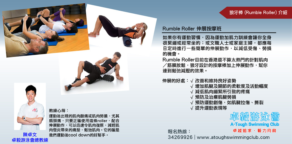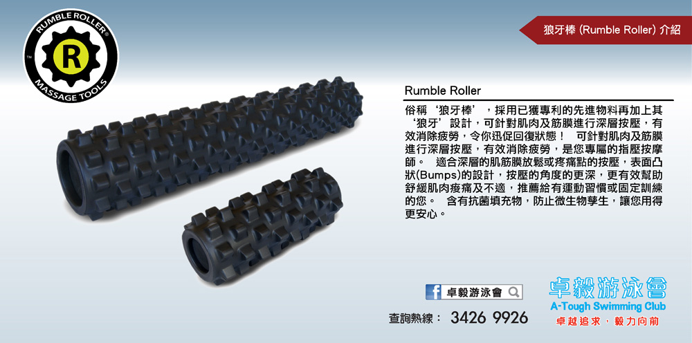 Rumble Roller目前在香港還不算太熱門的針對肌肉/筋膜放鬆跟狼牙設計的按摩棒加上伸展動作,幫你達到鬆弛減壓的效果。
