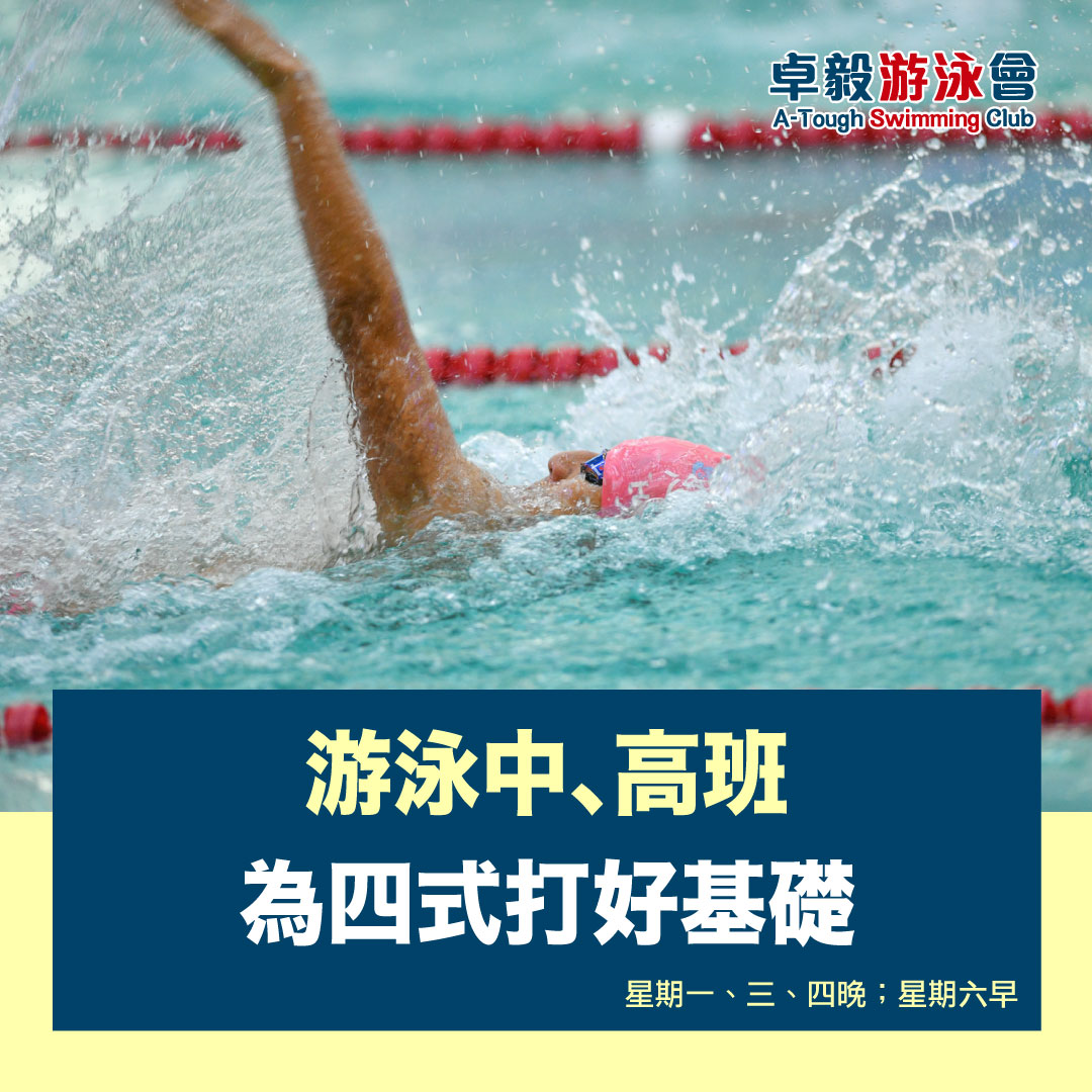 游泳中、高班是為希望游泳更進一步既你展開游泳旅程,為你打好基礎,提高水性,目標是更輕鬆、容易游好四式(蝶、背、蛙、自),另為將來希望參加不同類型的游泳比賽(渡海泳、游泳、三項鐵人比賽)作為一個踏腳石。