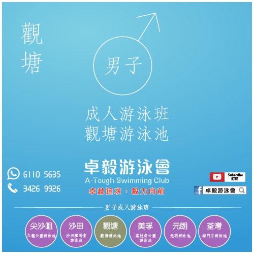觀塘上課游泳池:室內25米游泳池(如室內池因水運會關閉,上堂地點會轉到室外副池進行)