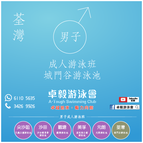 一個專為男性而設的游泳班,所有學員和教練都是男性。 我們有十年教學經驗,學游泳關鍵是恆常練習,學員一星期出席三次的練習,一個月內成率是95% ;相反,不能定時出席,而一星期一次練習的學成率只