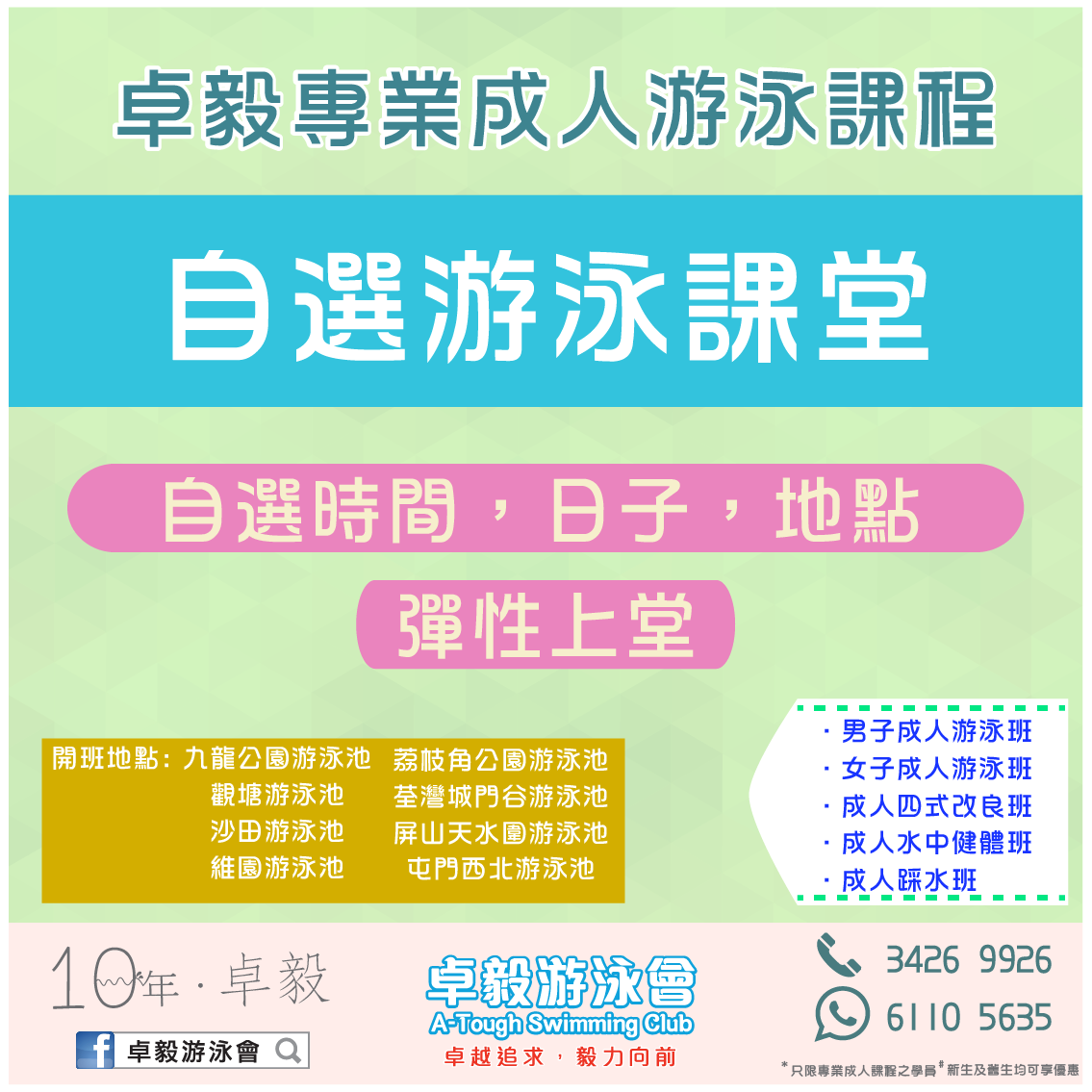 一個專為時間不固定的你而設的游泳班,可於各區已成班的女子成人游泳班/男子成人游泳班/成人四式改良班的時間表自由選擇上堂時間和日子。