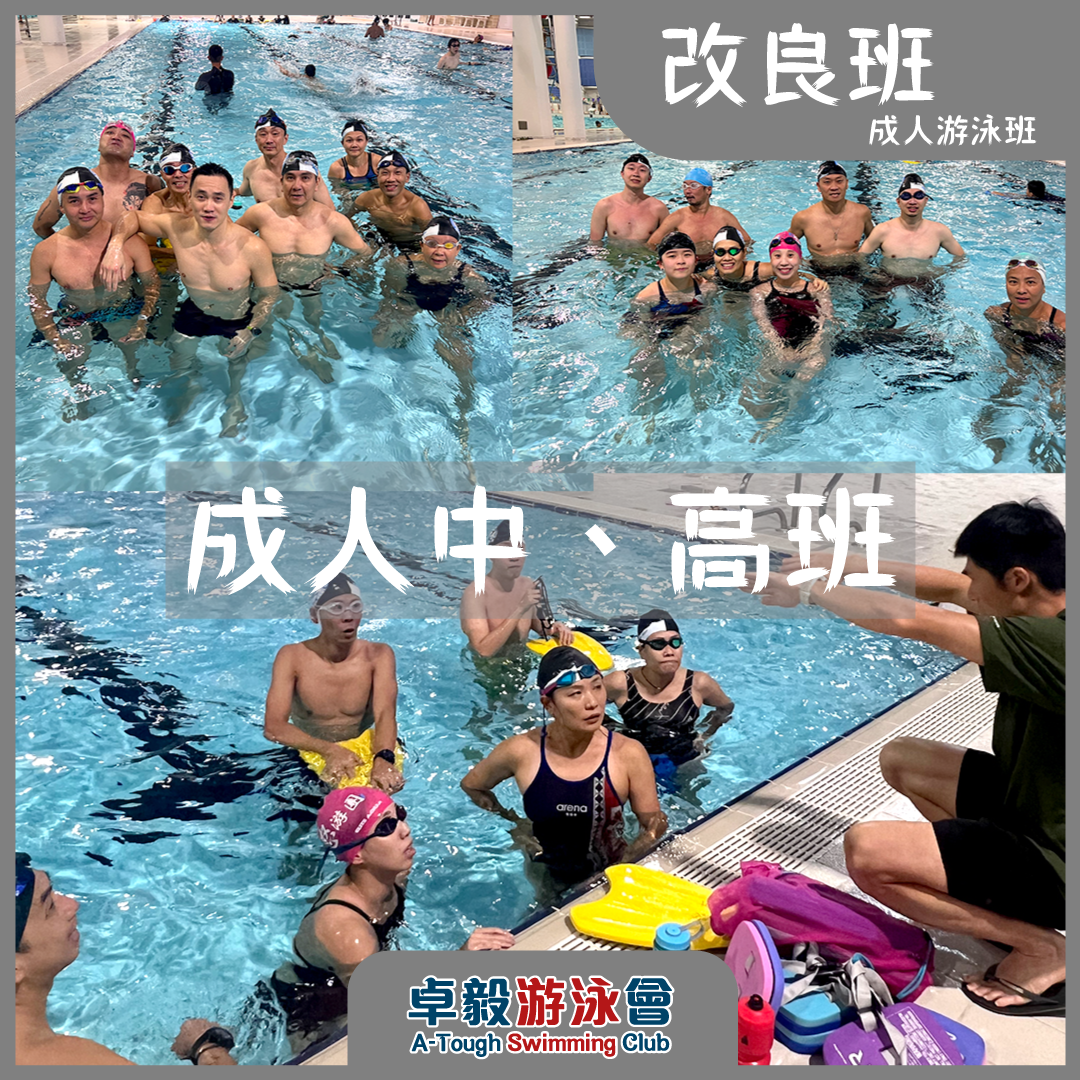 專業成人游泳班專為成人而設的游泳班,亦是本會最多人參加的游泳班。我們另設有女子成人游泳班,男子成人游泳班,成人中、高游泳進階班,操水班。