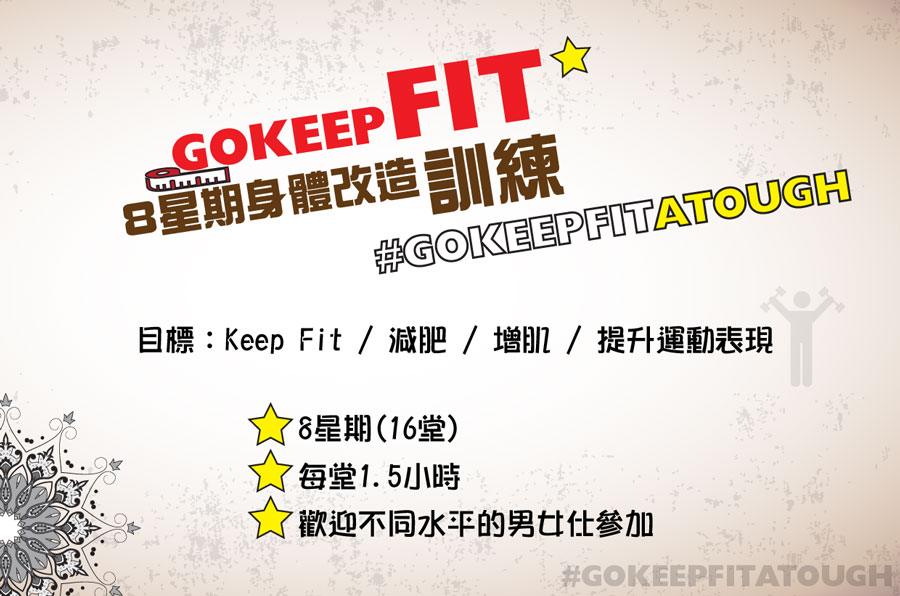 8星期身體改造訓練以成人為主的減肥班,是由卓毅游泳會的Sportnfitness舉辦的,以團體運動方式推廣,開始一個屬於自己的運動保健計劃。本會之Gokeepfitatough(減肥班)一條龍教學方式以飲食概念,訓練技巧,全身燒脂,強度訓練循序漸進學習,gokeepfit班學員以一星期減一至兩磅為目標之成功率達九成。出席次數90%以上,成功率達9成。出席次數不足50%,成功率只會得兩成。要成功必須先付出。